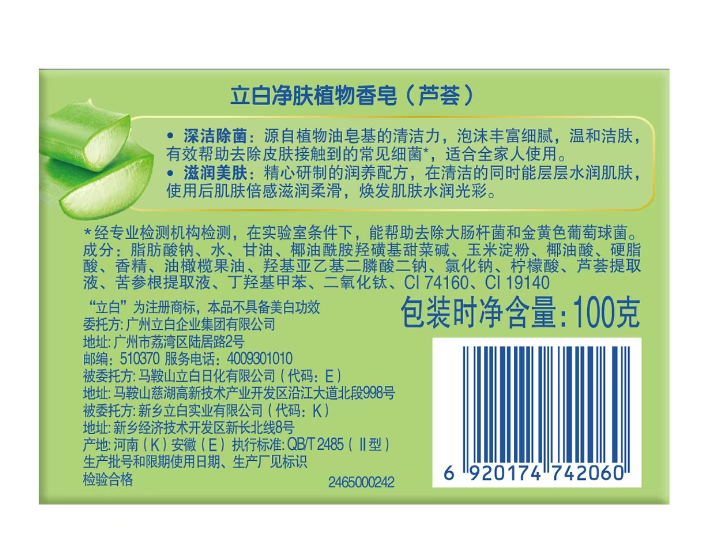 立白润肤除菌植物香皂(芦荟润肤)100g |