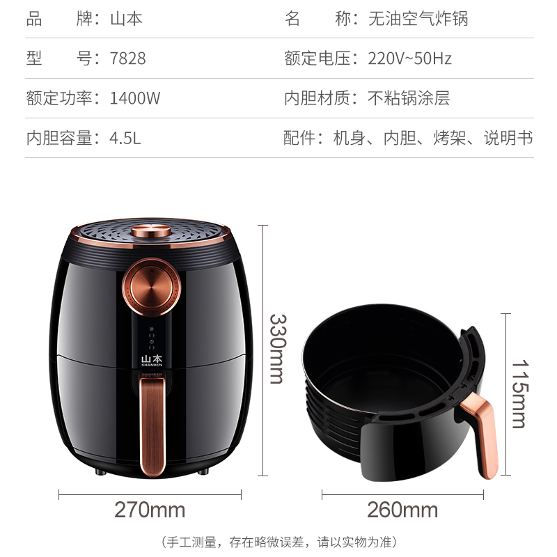 山本空气炸锅家用4.5升大容量多功能炸锅7828【PP/黑色】 |
