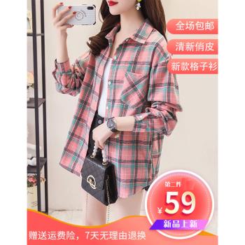 得听衬衫女2020秋装新款磨毛棉格子衬衫女秋夏季复古港味学生宽松休闲通勤百搭大码纯棉上衣女长袖外套 粉色格子(9号) M(100-115斤) |