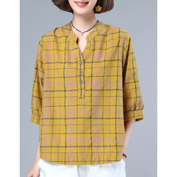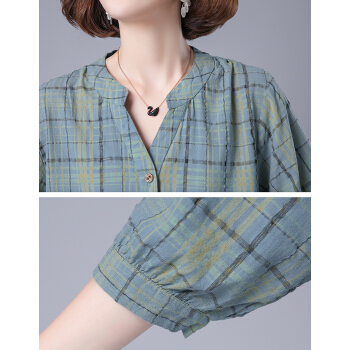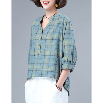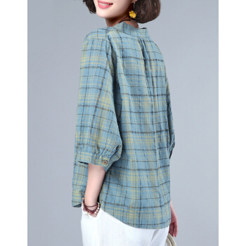 婪澈衬衫女2020女装夏季新款格子宽松薄款衬衣显瘦百搭七分袖上衣女 蓝色 请拍正确尺码 |