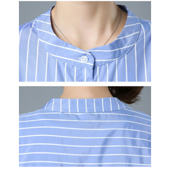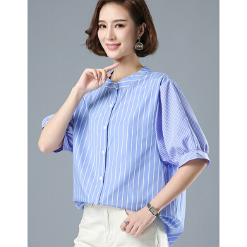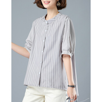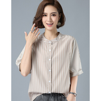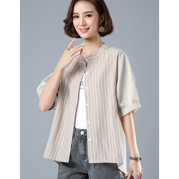 婪澈短袖条纹衬衫女2020女装夏新款小衫遮肚子休闲衬衣大码女装夏季衣服女短袖宽松立领上衣 米色 请拍正确尺码 |