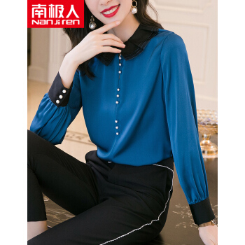 南极人 长袖衬衫女2020夏季新款女装时尚撞色绣花娃娃领衬衣原创设计纯色打底小衫上衣潮 N4-NRB42-5269-蓝色 M |