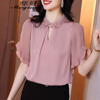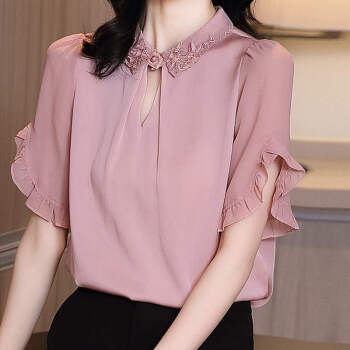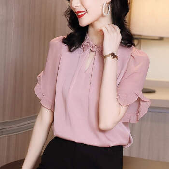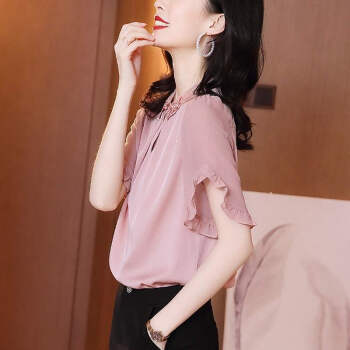 摩纤衬衫雪纺衫女仿 真丝2020夏季新款时尚气质纯色显瘦五分袖衬衫 粉色 S【建议95斤以内】 |