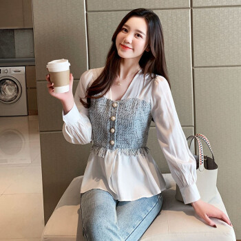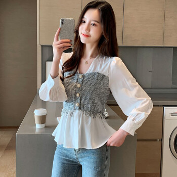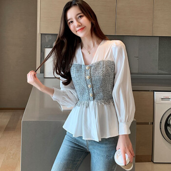 淑蔓婷衬衫女2020秋季新款V领收腰雪纺衫女长袖拼接时尚小衫气质上衣女 白色 S |