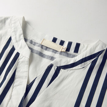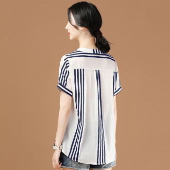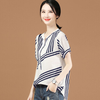 洋气球衬衫女2020夏季新品韩版设计感小众轻熟条纹女衬衫宽松V领短袖拼接薄款套头女上衣8349 藏蓝条 请拍正确尺码 |