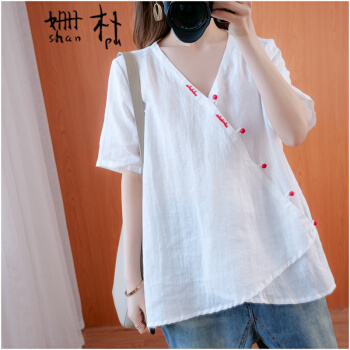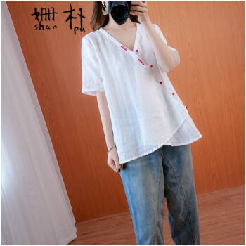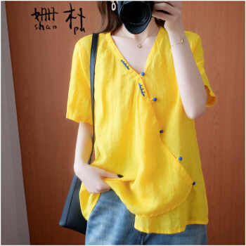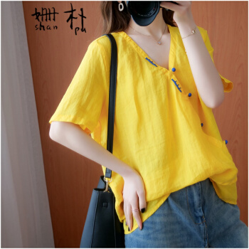 姗朴 棉麻衬衫女民族风2020夏季新款文艺复古大码女装胖mmV领盘扣宽松显瘦斜襟休闲短袖T恤上衣女 黄色 大码均码 |
