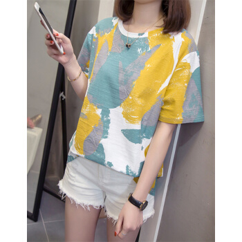 云妆蝶梦短袖t恤女大码女装棉麻2020新款夏季学生t恤卫衣显瘦减龄宽松半袖上衣女 黄色 L(建议90-120斤) |