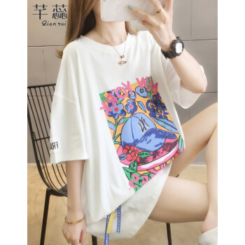 芊蕊短袖t恤女2020新款时尚韩版印花圆领中长款宽松大码女装胖MM半袖打底上衣服ins潮 粉红色 M |