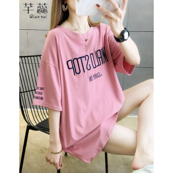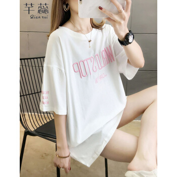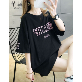 芊蕊短袖t恤女2020夏季新款韩版宽松大码女装中长款刺绣字母圆领短袖体恤上衣潮 黑色 L |