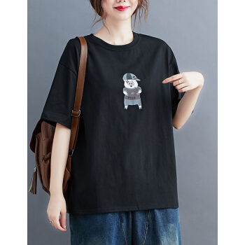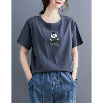 婪澈T恤女2020女装夏季新款文艺棉圆领印花短袖t恤女宽松大码休闲上衣女 深灰色 请拍正确尺码 |