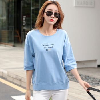 薇妃妙短袖气质t恤女2020夏季新款时尚宽松显瘦百搭体恤衫 天蓝色 L |