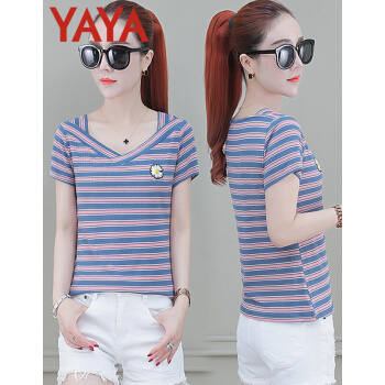 鸭鸭服饰yayaT恤女装夏季新款短袖夏装2020年新款衣服女短款条纹t恤女薄款修身洋气v领上衣 粉条纹 请选择正确尺码 |