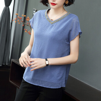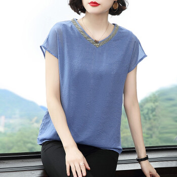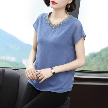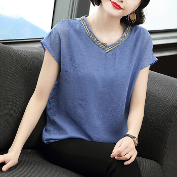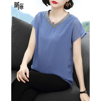 【精选好货】晞薇2020夏装新款时尚T恤女短袖韩版中年大码女装雪纺上衣夏妈妈装洋气宽松显瘦小衫遮肚 蓝色 请拍正确尺码 |