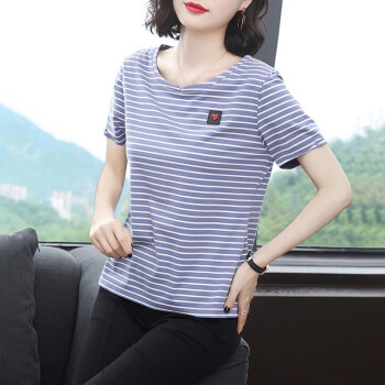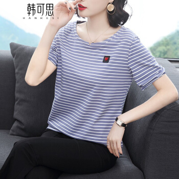 【精选好货】韩可思条纹短袖t恤女2020夏季新款韩版宽松百搭中年妈妈大码女装简约半袖蓝色上衣 蓝色 请拍正确尺码 |
