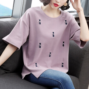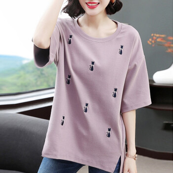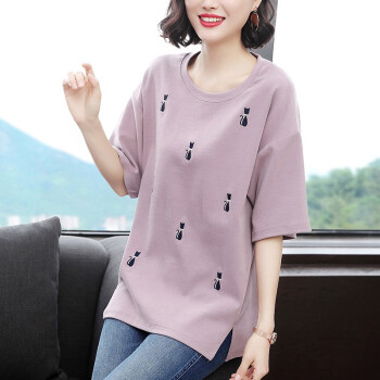 【精选好货】韩可思2020夏装新款大码女装宽松短袖t恤女小衫棉胖mm遮肚妈妈上衣衫中长款立体刺绣百搭 紫色 请拍正确尺码 |