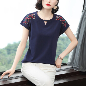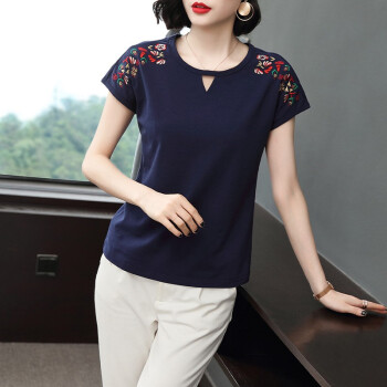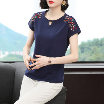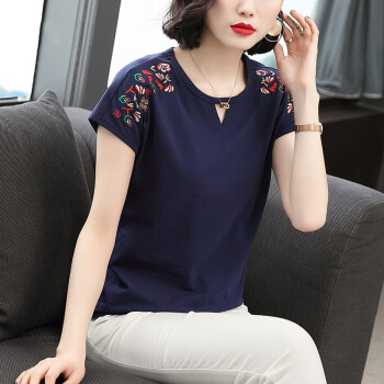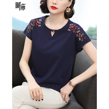【精选好货】晞薇棉短袖t恤女2020新款夏季时尚显瘦碎花半袖上衣宽松刺绣中年妈妈女装t桖 深蓝色 请拍正确尺码 |