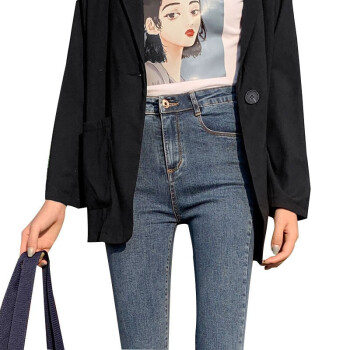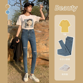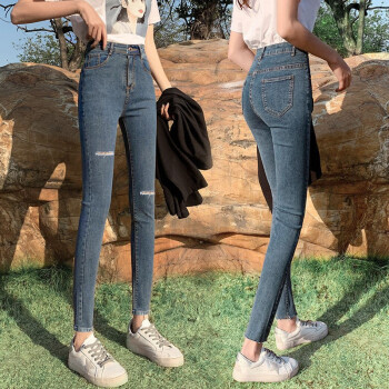 得听牛仔裤女2020年秋季新款韩版修身弹力显瘦显高春秋季黑色紧身九分小脚破洞高腰牛仔裤 (常规款)复古蓝 27(86-95斤) |