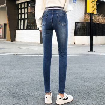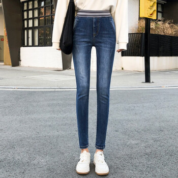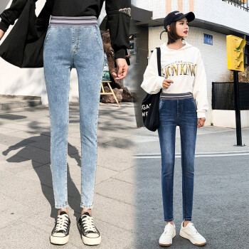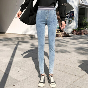 麦潮尚2020秋款牛仔裤女士长裤松紧高腰紧身显瘦弹力小脚女裤子 浅蓝色 XS建议70斤内 |