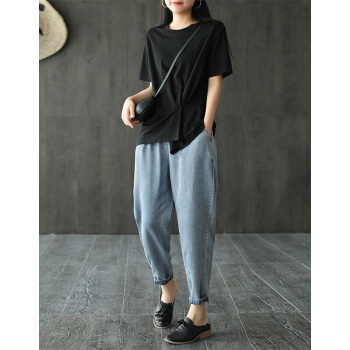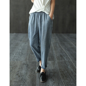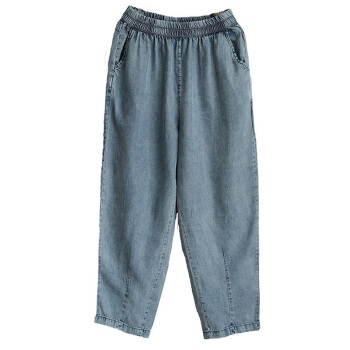 龙芝美 天丝牛仔裤女2020夏季新款复古文艺松紧腰宽松哈伦九分裤女 蓝色 请拍正确尺码 |