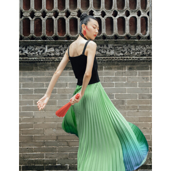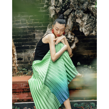 【商场同款】两三事 烟波流转 2020夏季新款时尚渐变色不规则百褶高腰半身裙 绿色 M |