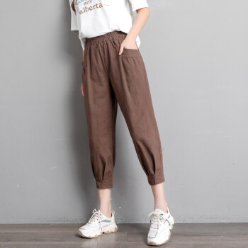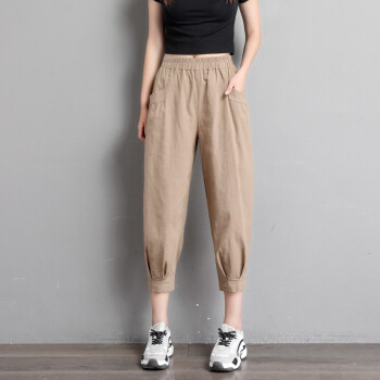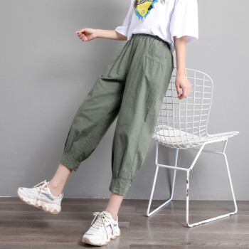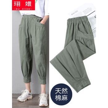珝嬛棉麻休闲裤女七分哈伦裤子2020新款学生胖mm高腰宽松显瘦夏季亚麻工装灯笼裤女薄款运动裤大码女装 军绿色 此码勿拍.请拍自身对应码数 |