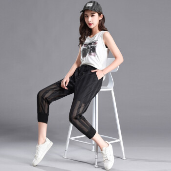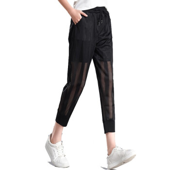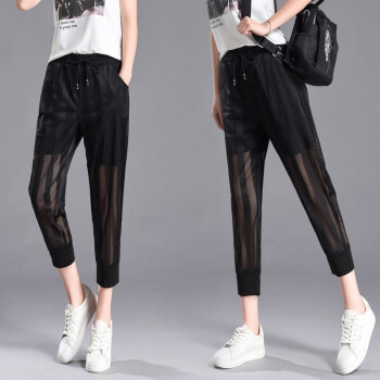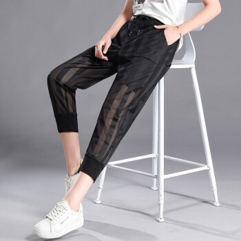 干如鑫休闲裤女运动裤女2020夏季新款时尚网纱哈伦裤子女学生显瘦七分裤宽松运动百搭高腰大码灯笼裤女潮 图片色(黑色) M(90-100斤) |