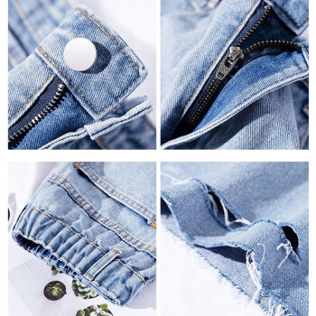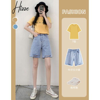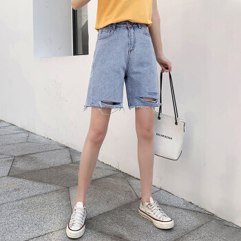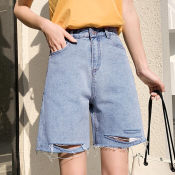 【精选好货】Hizze牛仔短裤女2020年新款潮夏季薄款5五分高腰a字宽松直筒港味百搭休闲中裤 浅复古蓝【破洞】 请拍正确尺码 |