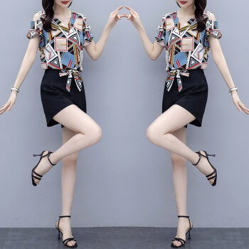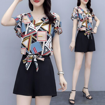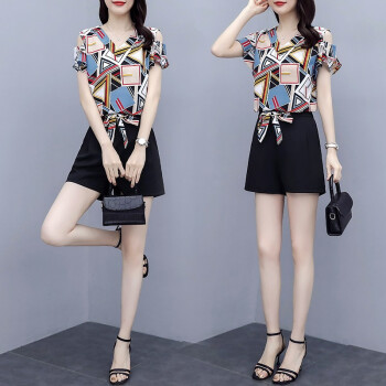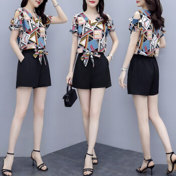 睡妍 短裤套装女2020夏装新款韩版休闲时尚女装大码显瘦时尚洋气印花短袖雪纺上衣短裤套装两件套女夏 图色 XL |