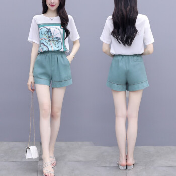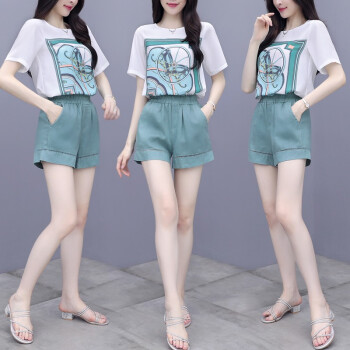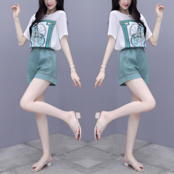 芙萝迪雅 2020新款洋气两件套宽松雪纺上衣配短裤女休闲时尚运动套装女夏 绿色 L |