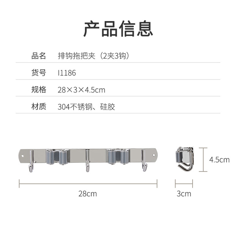 排钩拖把夹(2夹3钩)【304不锈钢 硅胶/图片色】 |