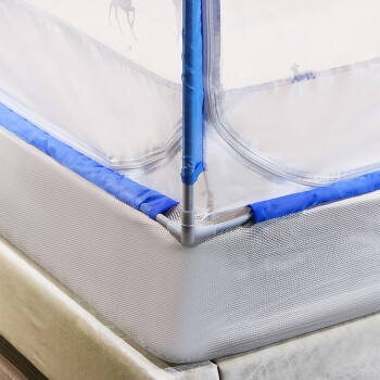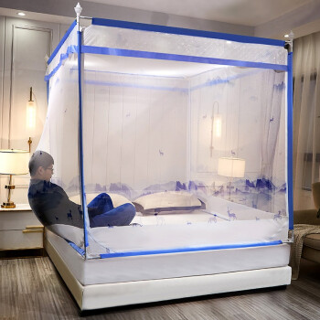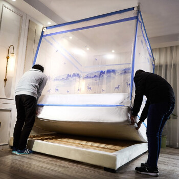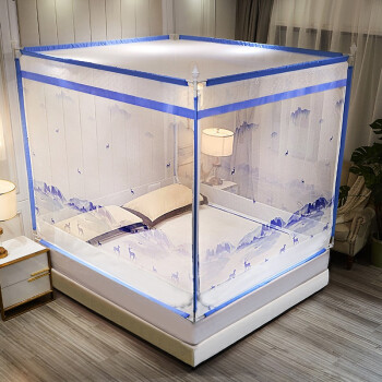 含烟家纺 防摔蚊帐1.8米三开门拉链印花蒙古包方顶1.5米床坐床双人家用蒙古包蚊帐免安装1.2米床 山水鹿-蓝 1.2*2米床使用 |