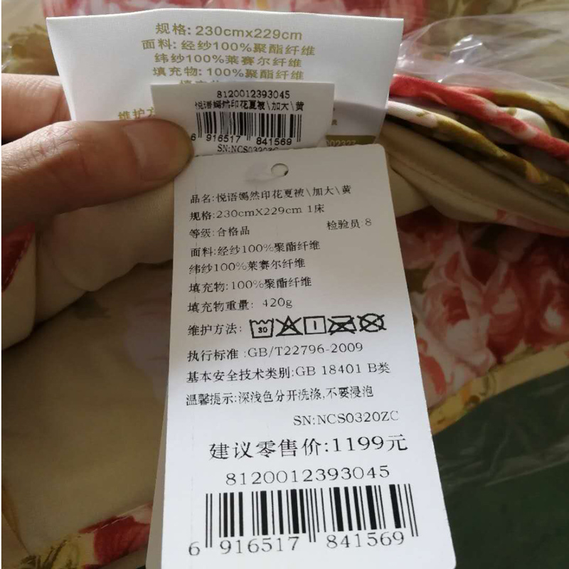 悦语嫣然涤天丝印花夏被(夏被一件)(适合1.8米床)【聚酯纤维+莱赛尔纤维/黄】 |