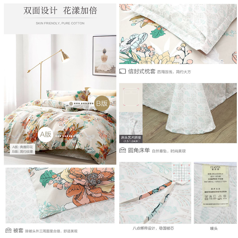 陌上花颜 床单三件套(被套1件床单1件枕套1件)(适合1.2米床)【纯棉/黄】 |