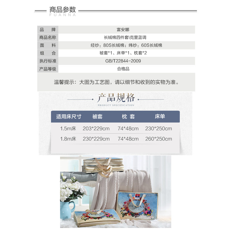克里蓝调 床单四件套(被套1件床单1件枕套2件)(适合1.5米床)【长绒棉/蓝】 |