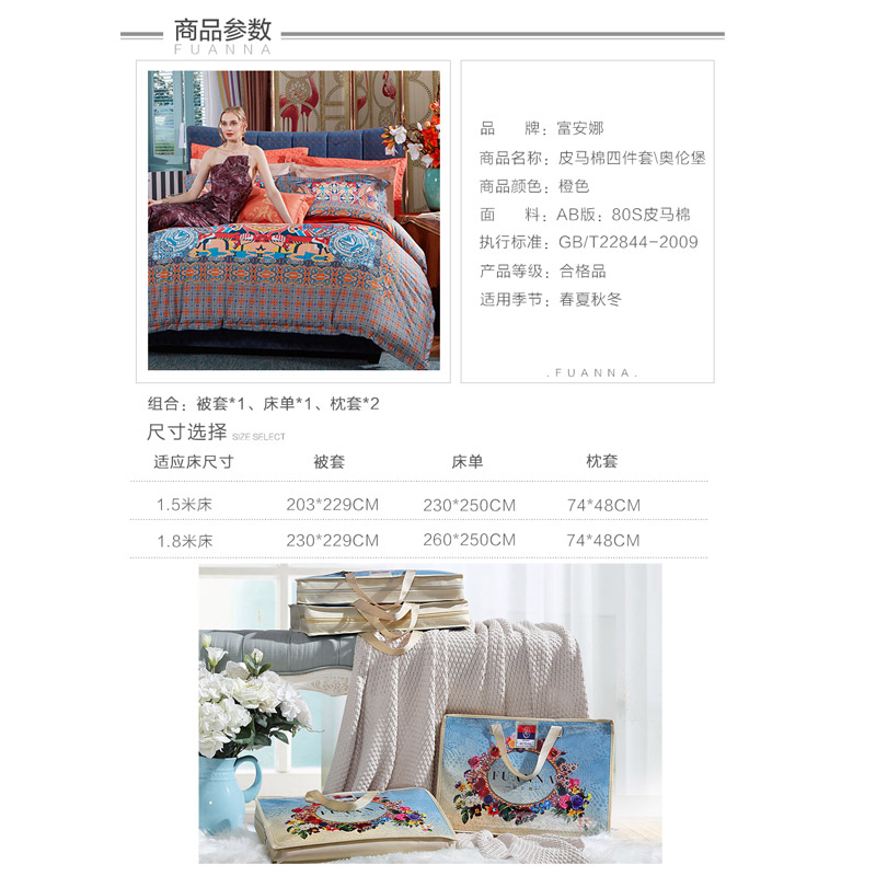 奥伦堡 床单四件套(被套1件床单1件枕套2件)(适合1.8米床)【皮马棉/橙】 |