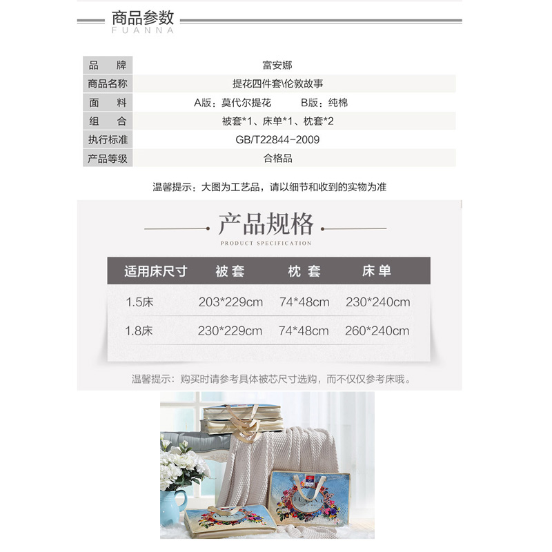 伦敦故事 床单四件套(被套1件床单1件枕套2件)(适合1.5米床)【A版:莫代尔提花;B版:纯棉/蓝】 |
