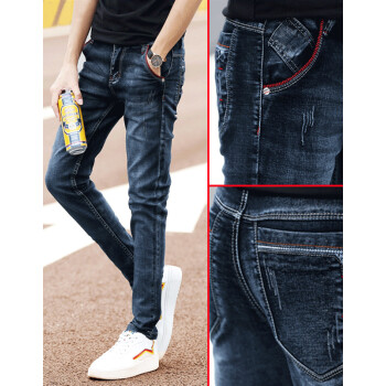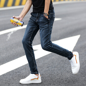 牛仔裤男2020春夏修身小脚裤男韩版休闲裤子男士潮流水洗牛仔直筒长裤青少年百搭运动裤男装 002蓝黑 30码-2尺3 |