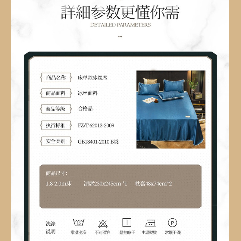 无印纯色床单款冰丝凉席三件套可机洗【冰丝面料(聚酯纤维)/贵族-蓝】 |