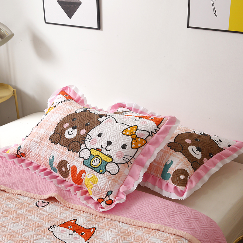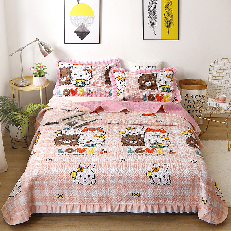 【三层复合】全棉夹棉绗缝床盖三件套【全棉/喵小琪-粉】 |