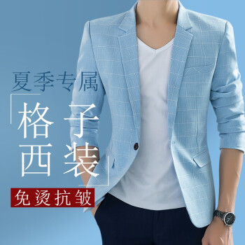 西服男春秋仿亚麻男士休闲西服格子小西装修身韩版潮流单西外套帅气上衣夏季超薄款颜丁 格子 灰色 48/M【115斤以内】 |