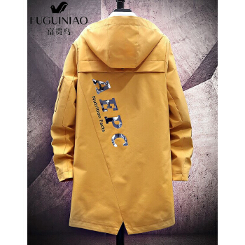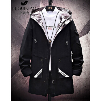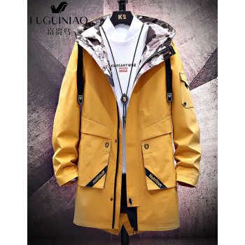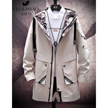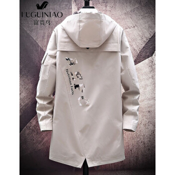 富贵鸟风衣男中长款外套春秋款青年时尚宽松连帽工装夹克男大码韩版加绒加厚外套男 1033卡其色--春秋款 XL码(适合120-140斤) |