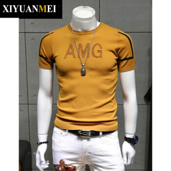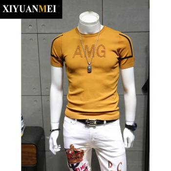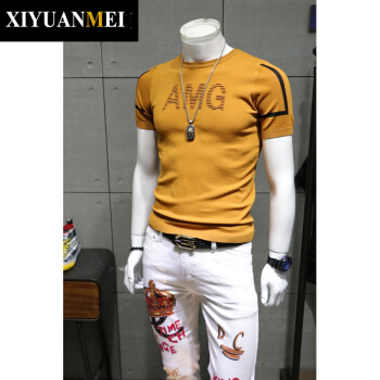 西原美潮牌 短袖毛衣男士 2020夏季韩版简约刺绣圆领修身打底针织衫男FD-FD-2250 黄色 180/92A |