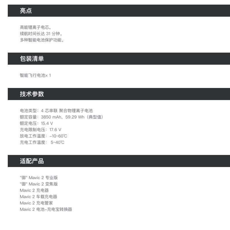 大疆 Mavic 2 专用配件 智能飞行电池 3850 mAh【其他/其他】 |