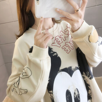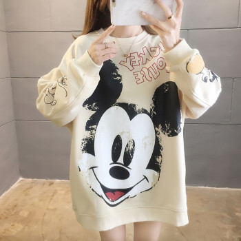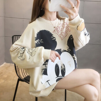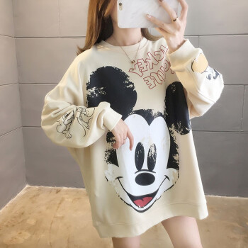卡赫希卫衣女2020春秋季新款韩版慵懒风中长款米奇印花圆领长袖百搭休闲女学生上衣潮女5005 杏色 请拍正确尺码 |