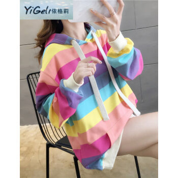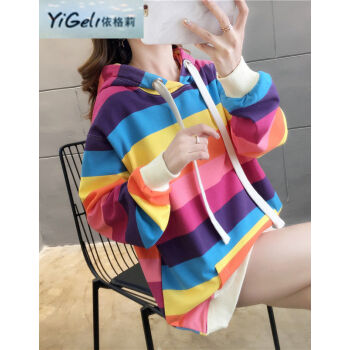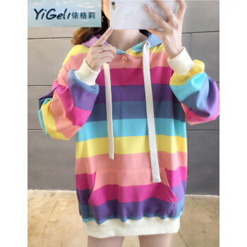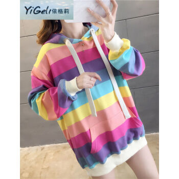 依格莉中学生少女秋天流行卫衣女2020春秋新款ins超火高中初中生宽松中长款彩虹条纹连帽大码长袖卫衣 浅色 M |