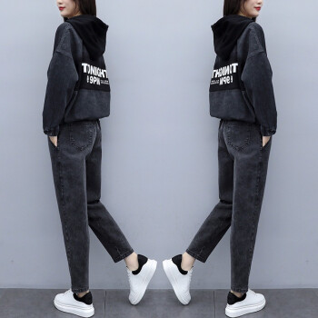 歌卡兰卫衣套装女牛仔2020秋季新品休闲气质显瘦时尚套装女运动服连帽外套女牛仔裤宽松卫衣女2317 黑色 XL |