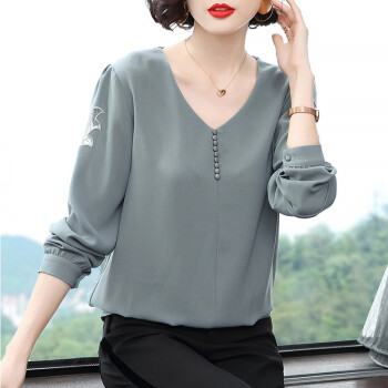 【精选好货】晞薇雪纺上衣2020新款春夏装时尚简约打底衫中年妈妈大码长袖T恤女洋气小衫遮肚宽松 浅灰蓝 请拍正确尺码 |