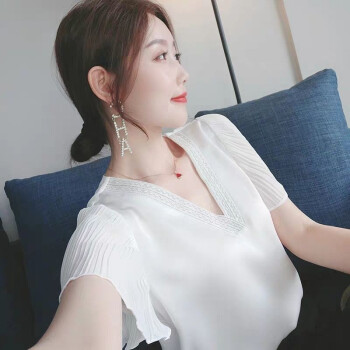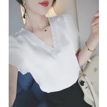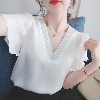 含蕴 超仙雪纺衫女2020夏季新款白色短袖宽松v领上衣洋气衬衫气质小衫衬衣女 白色 S |
