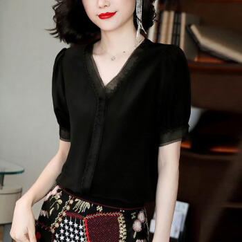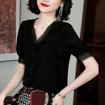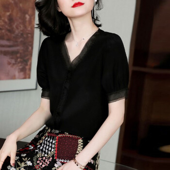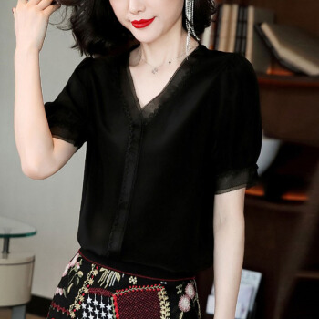 雪纺衫女短袖2020夏季新款女装韩版衬衫时尚设计感小众V领衬衣气质套头上衣潮 黑色 XXL |