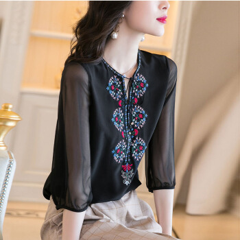 依语幽香复古绣花雪纺衫女2020夏季新款时尚v领透视短袖上衣 黑色 L |